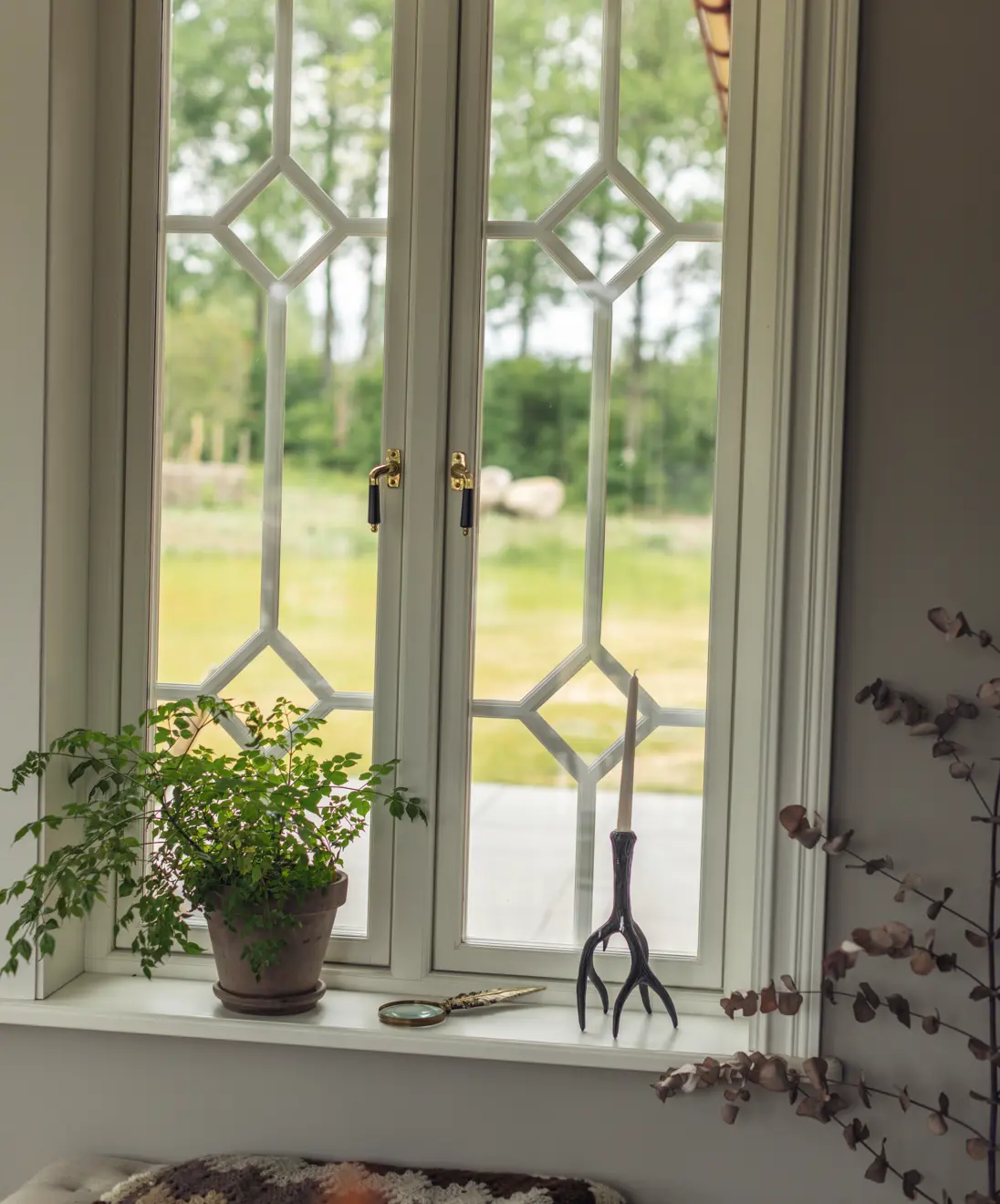 Fönstren är 2+1 med glaserade träspröjs i ytterbågen med kittfals, kulörmålad utsida och vit insida. Fönster som dessutom är otroligt energisnåla.