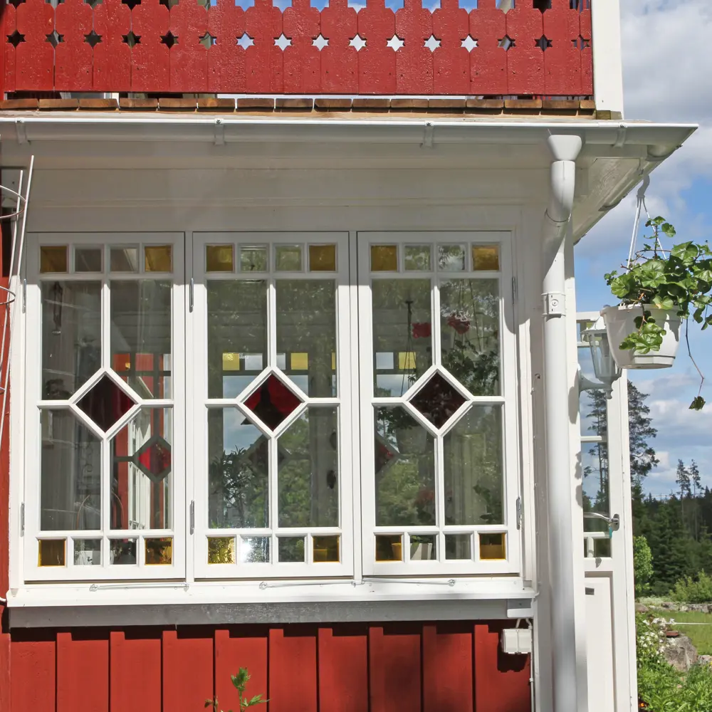 Traditionella gammaldags fönster glasade med 4 mm enkelglas och kittfals.
